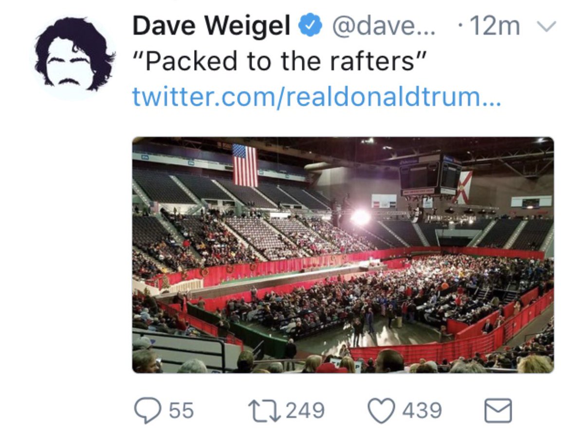 .@DaveWeigel @WashingtonPost put out a phony photo of an empty arena hours before I arrived @ the venue, w/ thousands of people outside, on their way in. Real photos now shown as I spoke. Packed house, many people unable to get in. Demand apology & retraction from FAKE NEWS WaPo! pic.twitter.com/XAblFGh1ob