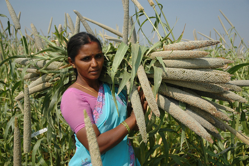 Pearl millet is a best bet to fight climate change. A hardy warm-season cereal crop, which grows in even during harsh climates. Indian women farmer with a bountiful of pearl millet panicles. Photo by ICRISAT/Mongabay India