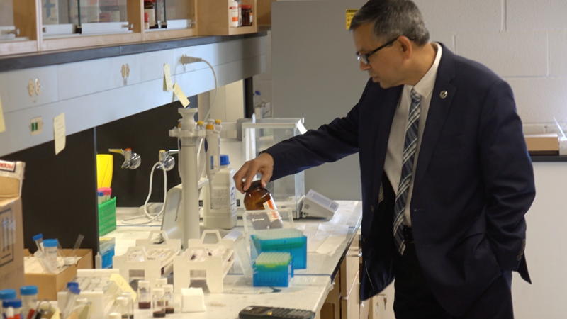 Dr. Kattesh Katti, a University of Missouri medical professor studying the use of herbal medicine for cancer, works in his lab.