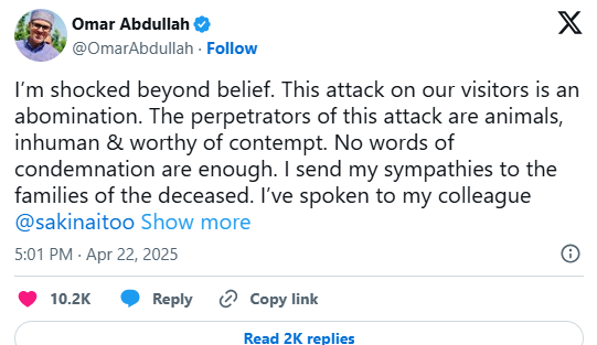 "I’m shocked beyond belief. This attack on our visitors is an abomination. The perpetrators of this attack are animals, inhuman & worthy of contempt. No words of condemnation are enough. I send my sympathies to the families of the deceased. I’ve spoken to my colleague @sakinaitoo & she has moved to the hospital to oversee arrangements for the injured. I’ll be flying back to Srinagar immediately. #Pahalgam," he posted on X.