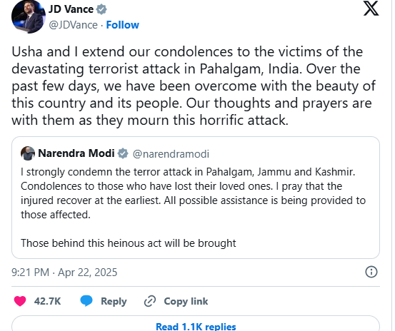 The attack took place at a time when US Vice President JD Vance was visiting India, and Modi arrived in Saudi Arabia for a two-day visit.