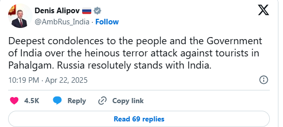 Russian Ambassador to India Denis Alipov condemned the attack and expressed solidarity with India.
