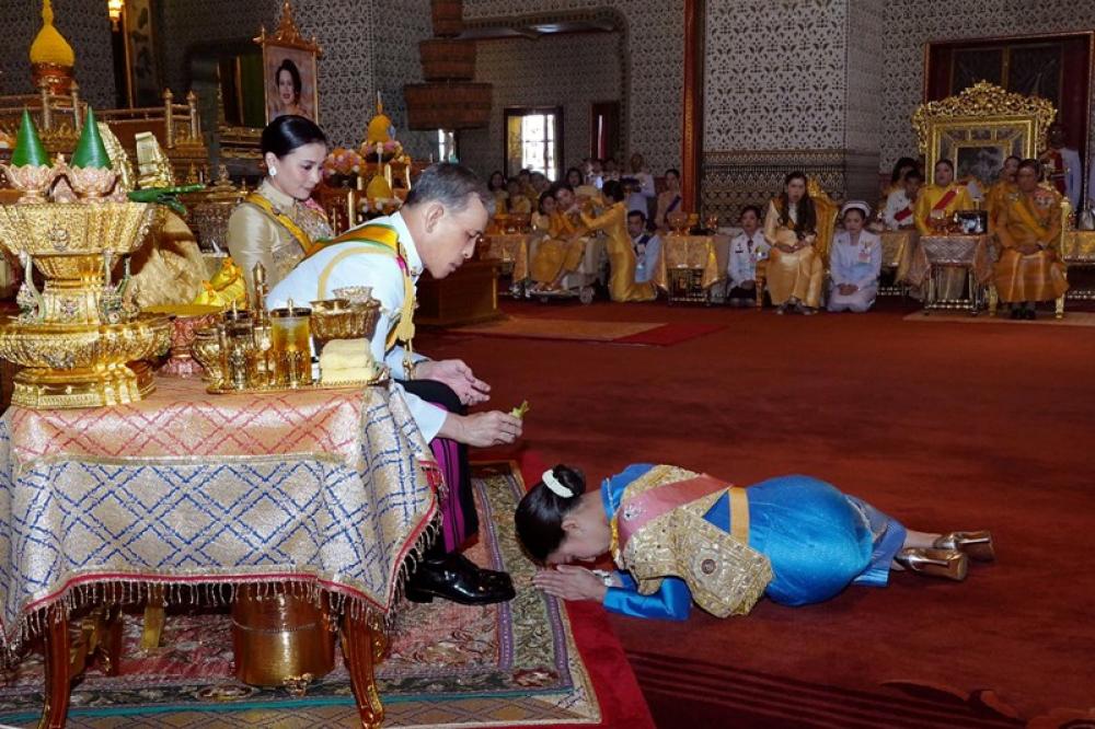 BANGKOK, May 7, 2019 (Xinhua) -- Thai King Maha Vajiralongkorn pours sacred water on the head of Princess Bajrakitiyabha to grant new title and royal medals to her in Grand Palace, Bangkok, Thailand, on May 5, 2019. Thailands newly crowned King Maha Vajiralongkorn on Sunday granted new titles to the members of the royal family after he was crowned in the Baisal Daksin Throne Hall of the Grand Palace in Bangkok on Saturday.