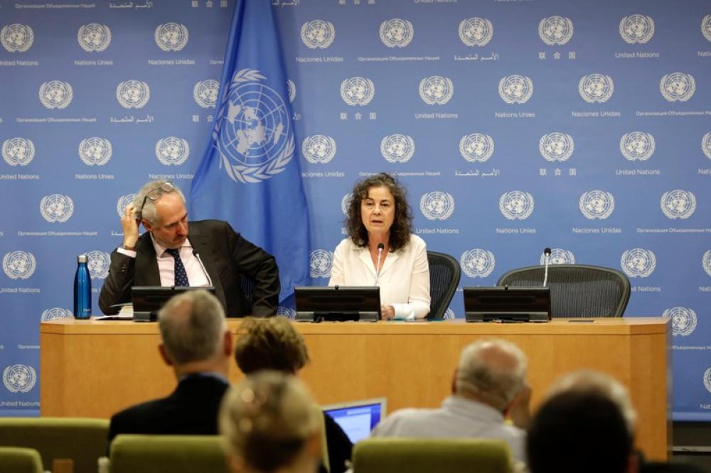 UNITED NATIONS, June 20 (Xinhua) -- Ninette Kelley (R), Director of the New York Office of the United Nations High Commissioner for Refugees (UNHCR), briefs journalists at the UN headquarters in New York, June 19, 2019. Almost 70.8 million people were forcibly displaced in 2018, with a 2.3-million increase compared to the previous year, according to the annual Global Trends report released ahead of the World Refugee Day by the United Nations Refugee Agency.