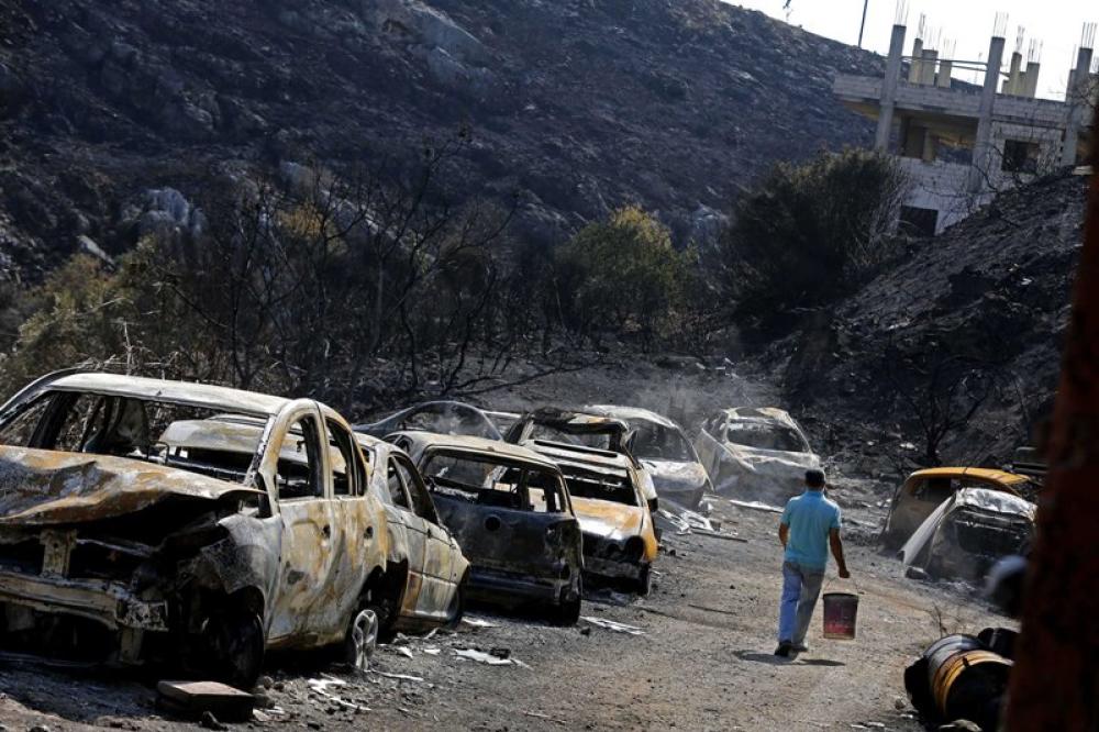 BEIRUT, Oct. 16, 2019 (Xinhua) -- Destroyed cars are seen after a fire in Damour District, south of Beirut, Lebanon, Oct. 16, 2019. Hectares of the mountains and a number of houses were destroyed by the wildfires in the Mount Lebanon areas.