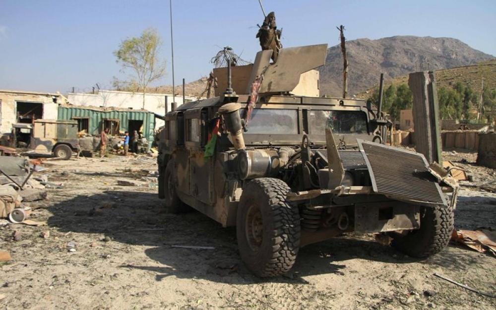 MEHTARLAM, Oct. 16, 2019 (Xinhua) -- Photo taken on Oct. 16, 2019 shows a damaged military vehicle at the site of a car bomb in Alishing district of Laghman province, Afghanistan. Two police officers and a civilian were killed and 43 people wounded after a car bomb blast rocked Alishing district in Afghanistans eastern Laghman province on Wednesday, the district chief said.