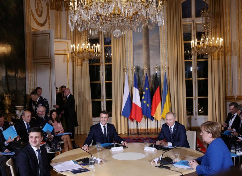 PARIS, Dec. 10 (Xinhua) -- Ukrainian President Volodymyr Zelensky, French President Emmanuel Macron, Russian President Vladimir Putin and German Chancellor Angela Merkel (L to R) attend Normandy four summit in Paris, France, Dec. 9, 2019. Ukraine and Russia agreed on a full and comprehensive implementation of the ceasefire in eastern Ukraine before the end of 2019, leaders of Russia, Ukraine, France and Germany announced in Paris on Monday evening following their talks called Normandy four summit.