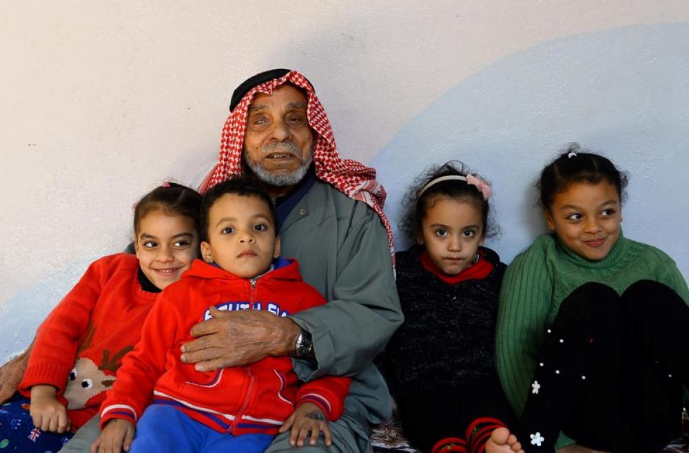 GAZA, Dec. 18 (Xinhua) -- Suleiman Abu-Namous sits with his family members in Jabalia refugee camp in the northern Gaza Strip, Dec. 17, 2019. Suleiman Abu-Namous from Gaza recently breathed a sigh of relief after hearing that the mandate of the United Nations Relief and Works Agency for Palestine Refugees in the Near East (UNRWA) will be extended for another three years. The UNRWA has been a lifeline and a provider of basic services for some five million Palestinian refugees in the region, including the 110-year-old man and his family. TO GO WITH Feature: Palestinian refugees see UN relief agency as lif