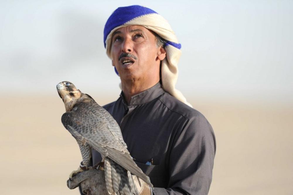 JAHRA GOVERNORATE, Dec. 29, 2019 (Xinhua) -- A man holds a falcon during a training show in Jahra Governorate, Kuwait, Dec. 28, 2019. Kuwaiti falcon lovers held on Saturday a falcon training show in the desert of Jahra Governorate to introduce how falcons hunt in desert.