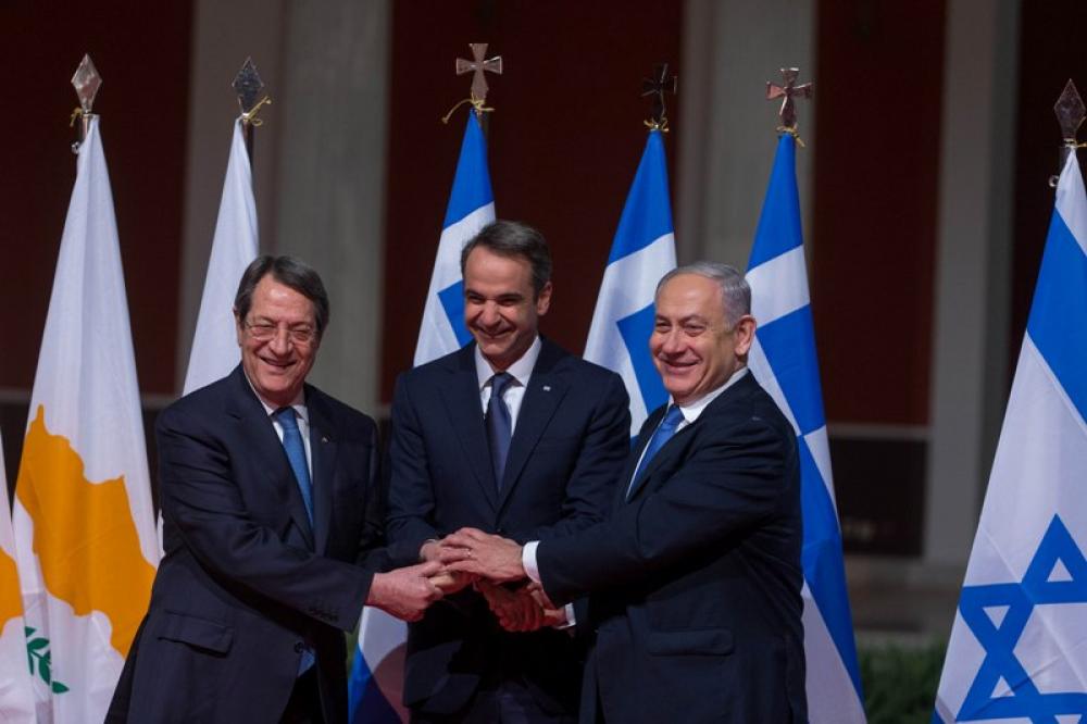 ATHENS, Jan .3, 2020 (Xinhua) -- Cypriot President Nicos Anastasiades (L), Greek Prime Minister Kyriakos Mitsotakis (C) and Israeli Prime Minister Benjamin Netanyahu shake hands before the signing of an agreement for the construction of the Eastern Mediterranean (EastMed) natural gas pipeline, in Athens, Greece, on Jan. 2, 2020. Greece, Cyprus, and Israel signed here on Thursday the intergovernmental agreement for the construction of the Eastern Mediterranean natural gas pipeline which is to be linking the regions gas reserves to Greece and the rest of Europe.