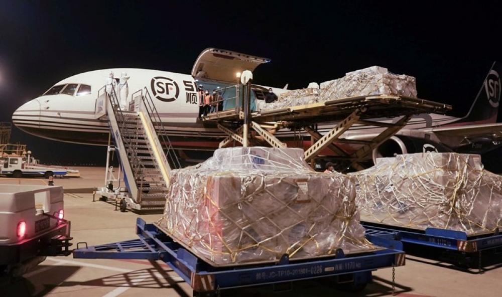 WUHAN, Jan. 31, 2020 (Xinhua) -- Staff members unload protective suits purchased by Zall Foundation to aid the coronavirus control efforts from a cargo plane at Tianhe International Airport in Wuhan, central Chinas Hubei Province, Jan. 30, 2020.