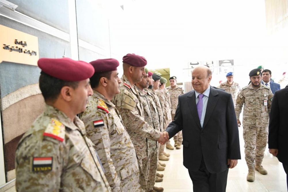 RIYADH, Jan. 31, 2020 (Xinhua) -- Yemens President Abd-Rabbu Mansour Hadi shakes hands with commanders of the joint forces of the Saudi-led Arab coalition in Riyadh, Saudi Arabia, Jan. 30, 2020.