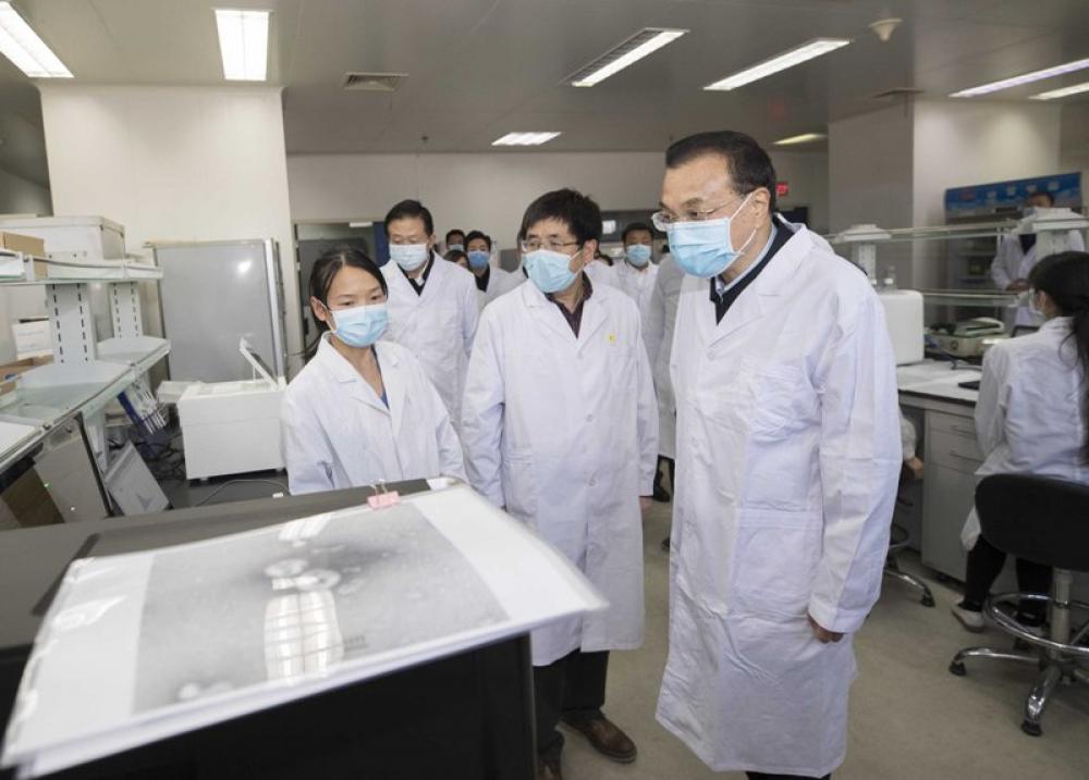 BEIJING, Jan. 31 (Xinhua) -- Chinese Premier Li Keqiang, also a member of the Standing Committee of the Political Bureau of the Communist Party of China (CPC) Central Committee and head of a leading group of the CPC Central Committee on the prevention and control of the novel coronavirus outbreak, learns about the progress of scientific research at the Chinese Center for Disease Control and Prevention (CDC) in Beijing, capital of China, on Jan. 30, 2020. Li learned about the scientific research on epidemic prevention and control and listened to opinions of medical experts while inspecting the CDC.