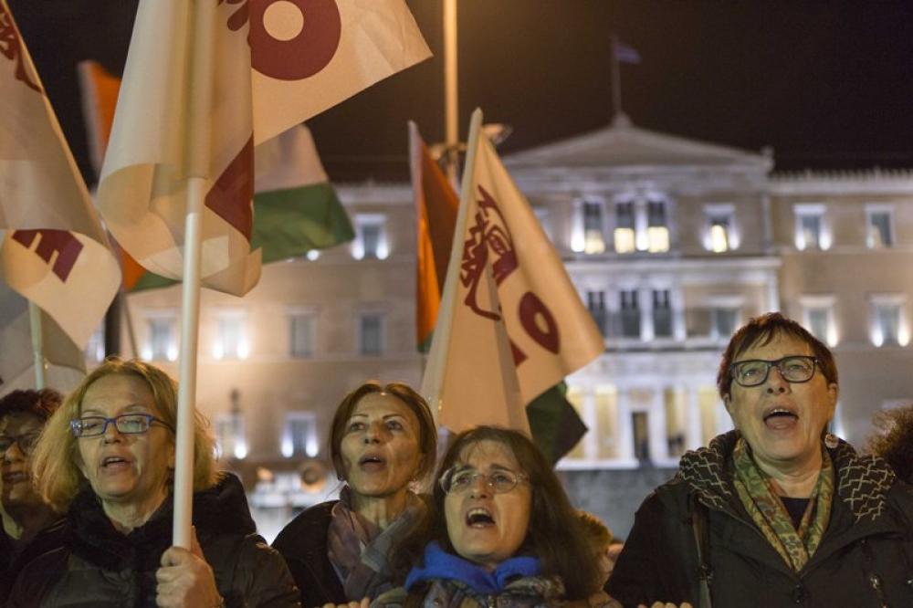 ATHENS, Jan. 31 (Xinhua) -- Protesters shout slogans during a demonstration in front of the Greek Parliament in Athens, Greece, on Jan. 30, 2020. Greek lawmakers ratified on Thursday an updated agreement with the United States on defense cooperation, while thousands of protesters were chanting slogans outside the parliament building opposing it, Greek national news agency AMNA reported.