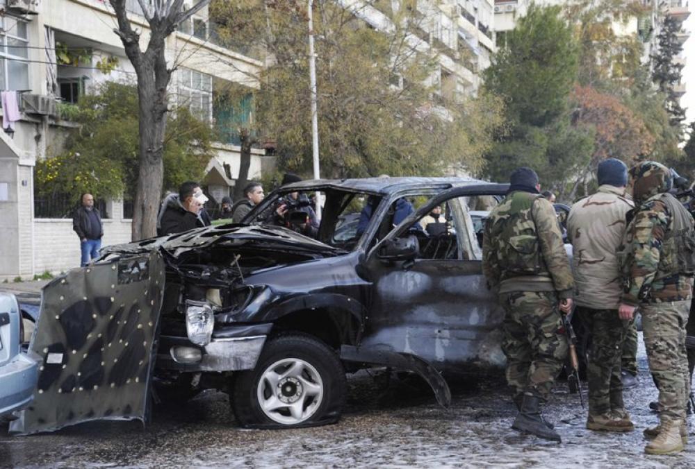 DAMASCUS, Feb. 11 (Xinhua) -- People check a damaged car following an explosion in the Mazzeh neighborhood in Damascus, Syria, on Feb. 10, 2020. One people was wounded on Monday when an explosive device ripped through a car in the Syrian capital Damascus, state news agency SANA reported.