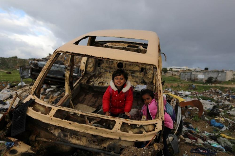 GAZA, Feb. 10, 2020 (Xinhua) -- Palestinian children play in the wreckage of a car at a poor neighborhood in southern Gaza Strip city of Khan Younis, Feb. 10, 2020. Gaza has been placed under a tight Israeli blockade since the Islamic Hamas movement seized the territory by force after routing forces loyal to President Mahmoud Abbas in 2007.The United Nations has repeatedly warned of a humanitarian deterioration in Gaza. In 2019, it issued a report warning that the Gaza Strip will not be suitable for living if Israel continues imposing blockade on the enclave.