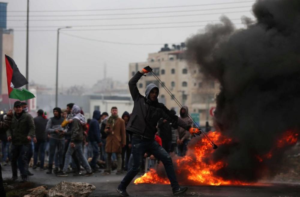 RAMALLAH, Feb. 12, 2020 (Xinhua) -- A Palestinian protester uses a slingshot to hurl stones at Israeli soldiers during clashes after a protest against the U.S. Mideast peace plan, at the West Bank city of Ramallah, Feb. 11, 2020. Thousands of Palestinians demonstrated on Tuesday in the West Bank and Gaza against the U.S. Mideast peace plan, known as the Deal of the Century. Photo by Ayman