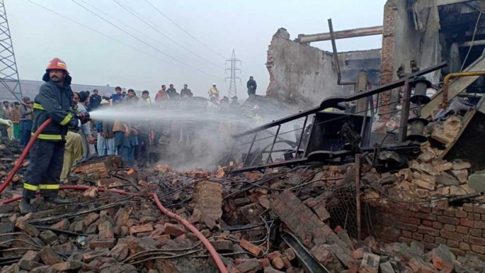 FAISALABAD (PAKISTAN), Feb. 12, 2020 (Xinhua) -- Rescuers work on the site of a collapsed factory in Faisalabad, Pakistans east Punjab province, on Feb. 11, 2020. Three laborers were killed and 12 others injured when the roof of a factory collapsed following the explosion of its boiler in Faisalabad, local media reported.
