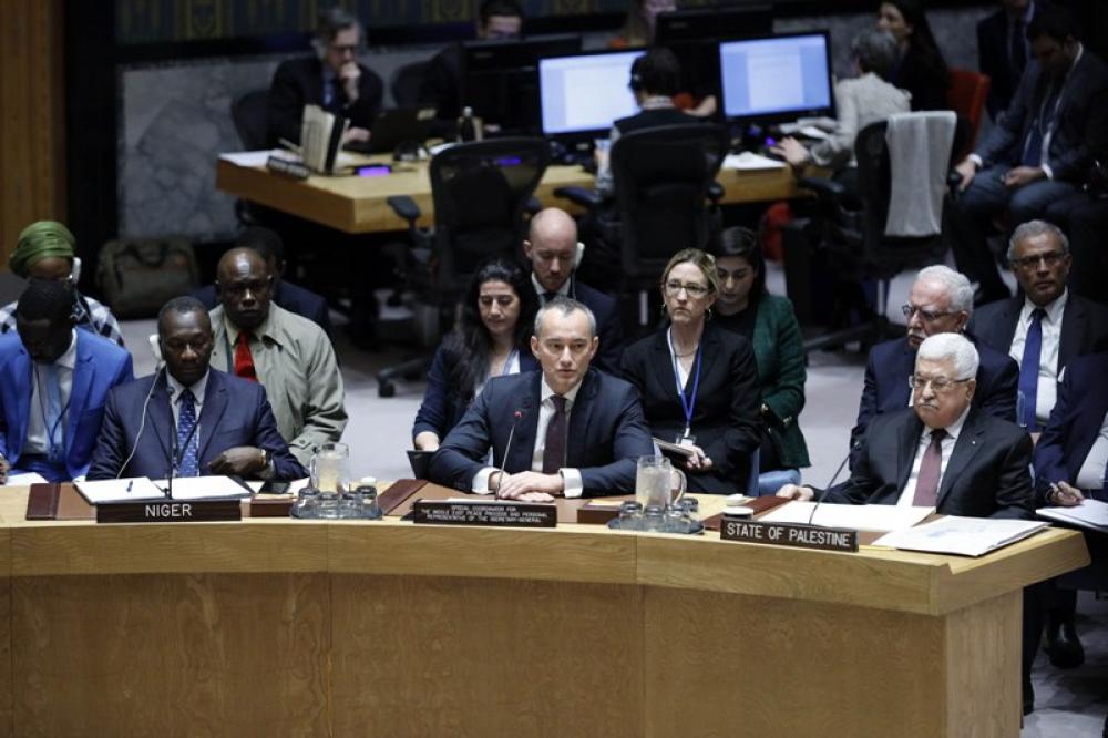 UNITED NATIONS, Feb. 12 (Xinhua) -- UN Special Coordinator for the Middle East Peace Process Nickolay Mladenov (C, Front) briefs a UN Security Council meeting on the situation in the Middle East, including the Palestinian question, at the UN headquarters in New York, on Feb. 11, 2020. Palestinian President Mahmoud Abbas on Tuesday reiterated the rejection of a newly released U.S. Middle East peace plan, calling it an Israeli-American proposal.