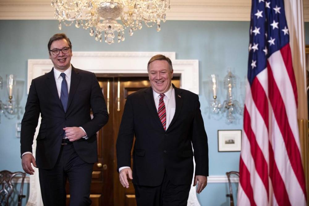 WASHINGTON, March 3 (Xinhua) -- U.S. Secretary of State Mike Pompeo (R) meets with Serbian President Aleksandar Vucic in Washington D.C., the United States, on March 2, 2020.