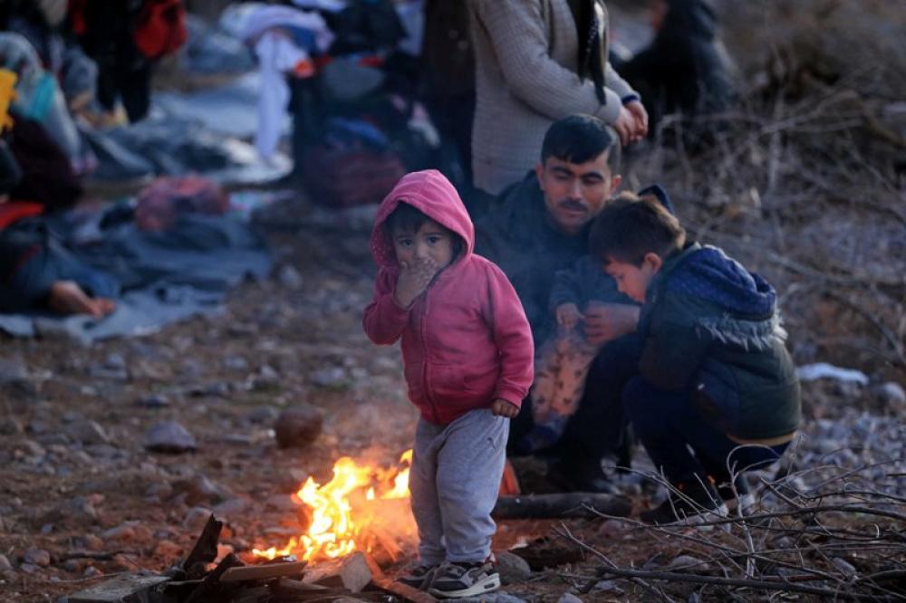 LESVOS (GREECE), March 3 (Xinhua) -- Migrants and refugees who have arrived from Turkey try to warm themselves by the fire at Skala Sikaminias, in the island of Lesvos, Greece, on March 2, 2020. Greece has adopted a tougher stance and is treating the migration challenge as a national security issue, Interior Minister Takis Theodorikakos said on Monday. X