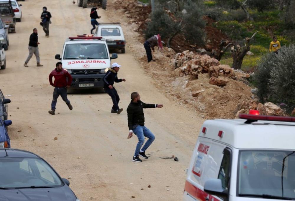 NABLUS, March 2, 2020 (Xinhua) -- Palestinian protester throw stones at Israeli soldiers during clashes, following a protest against Israeli settlement activity in al-Erma, in the West Bank village of Beta, near Nablus, March 2, 2020. Palestinian Red Crescent Society said that at least 10 Palestinians were injured with rubber coated bullets and at least 50 others broke their bones and suffered from tear gas grenades fired by Israeli soldiers in the village of Beita, near Nablus city.
