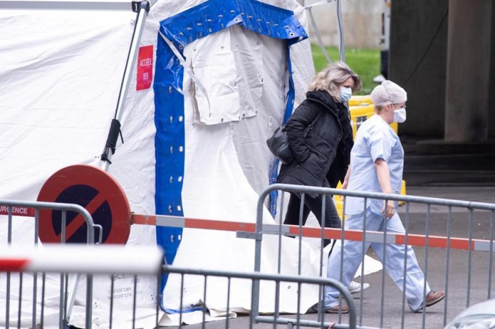 PARIS, March 11 (Xinhua) -- A nurse escorts a woman out of a tent to treat suspected COVID-19 cases in the courtyard of Henri Mondor Hospital in Creteil, France, March 10, 2020. With nearly 1,800 coronavirus infection cases and 33 deaths confirmed, France, the second worst affected European country, favors a proportional and progressive strategy to handle the virus crisis and hopes to avoid drastic measures as long as possible.
