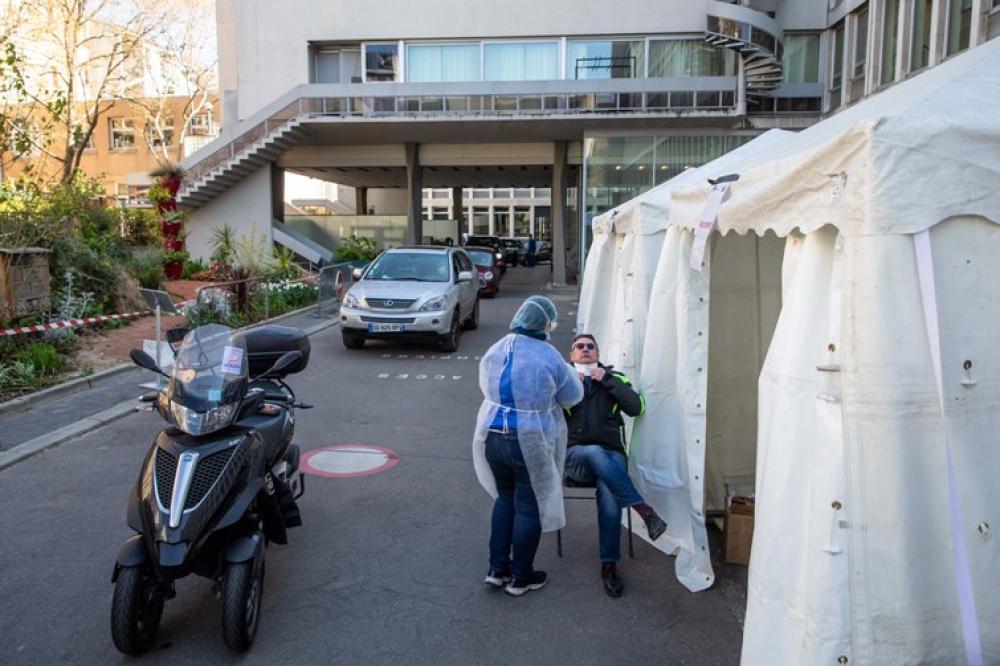 PARIS, April 2, 2020 (Xinhua) -- A medical biologist handles a swab to test a mediacal worker for the COVID-19 disease at a COVID-19 drive-in test center in Paris, France, April 1, 2020. A COVID-19 drive-in and screening center has opened at the City Hall of the 17th arrondissement of Paris in partnership with three laboratories in the arrondissement and is dedicated to healthcare professionals.
