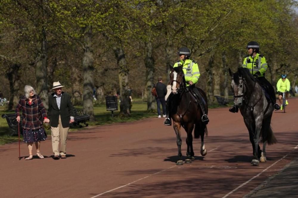 LONDON, April 14 (Xinhua) -- Photo taken on April 13, 2020 shows mounted police officers in Greenwich Park in London, Britain. The death toll of those hospitalized in Britain who tested positive for the COVID-19 reached 11,329 as of Sunday afternoon, marking a daily increase of 717, the Department of Health and Social Care said Monday. As of Monday morning, the number of confirmed cases of COVID-19 in Britain hit 88,621, said the department.