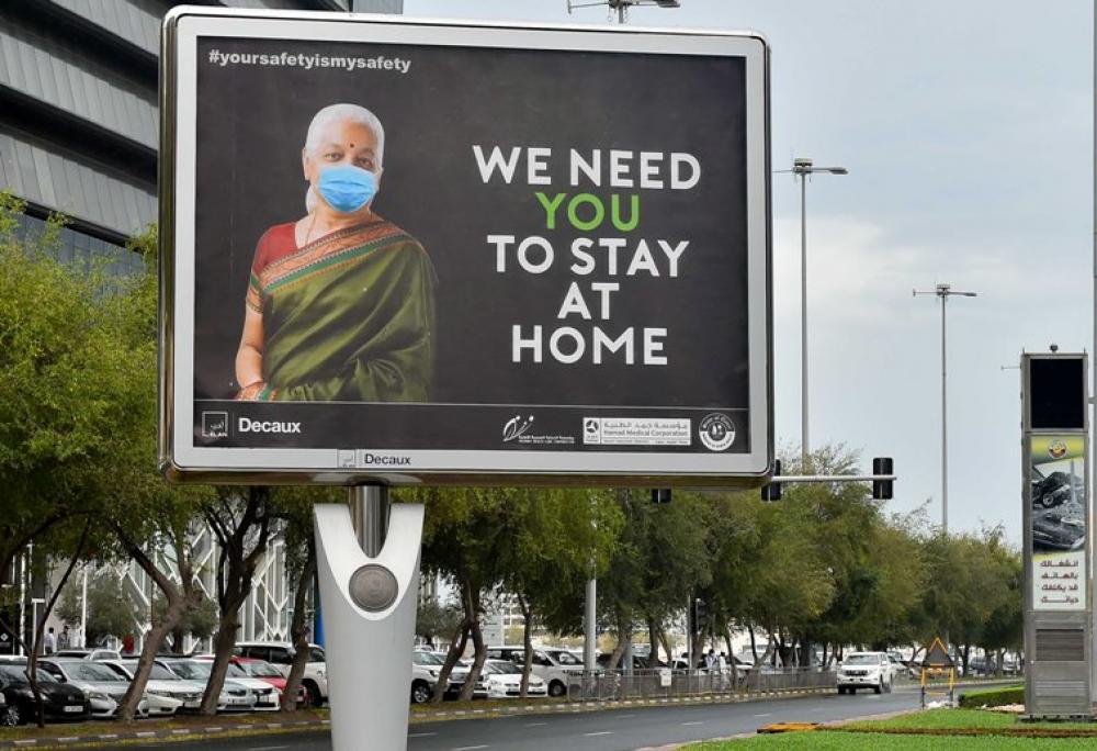 DOHA, April 14 (Xinhua) -- A COVID-19 awareness billboard is seen by the street in Doha, capital of Qatar, April 13, 2020.
