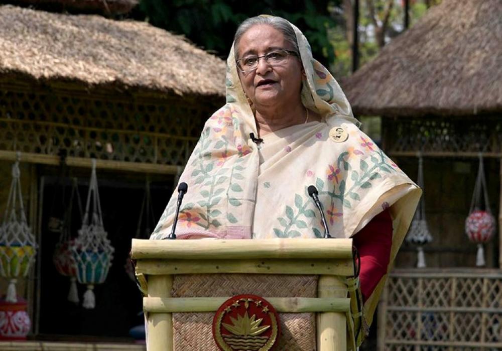 DHAKA, April 14 (Xinhua) -- Bangladeshi Prime Minister Sheikh Hasina speaks in a televised address to the nation in Dhaka, Bangladesh, on April 13, 2020. The Bangladeshi government has unveiled a special insurance scheme and allowance for health professionals and other COVID-19 front line fighters including law enforcement officials.