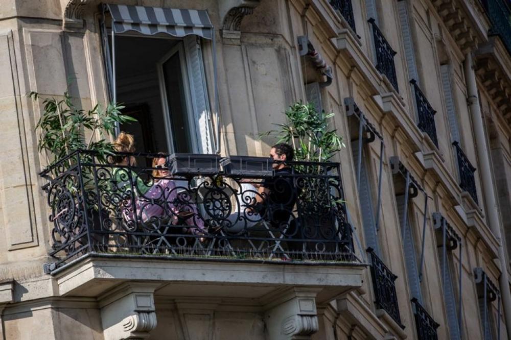 PARIS, April 14 (Xinhua) -- People enjoy themselves on the balcony in Paris, France, April 13, 2020. France would remain under a nationwide lockdown until May 11 to stem the spread of COVID-19 and reduce its impact on domestic health institutions, President Emmanuel Macron said on Monday evening.