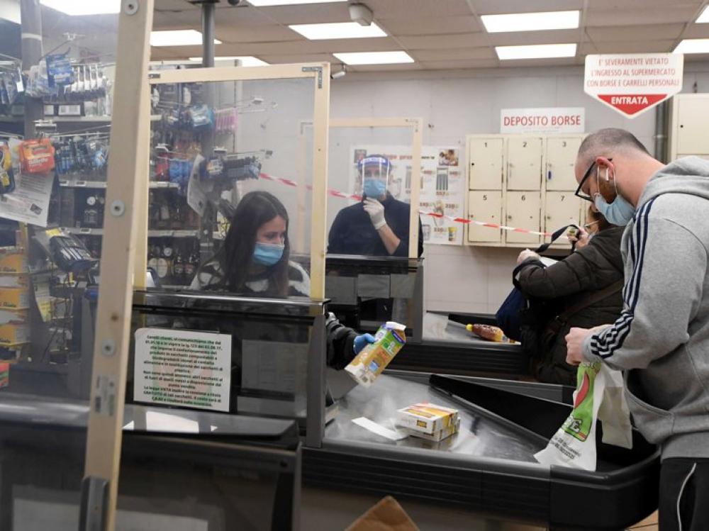 ROME, April 23 (Xinhua) -- Staff members wearing face mask and face shield work in a supermarket in Rome, Italy, April 22, 2020. The coronavirus pandemic has claimed over 25,000 lives in locked-down Italy, bringing the total number of active infections, fatalities and recoveries so far to 187,327, according to the latest data released by the countrys Civil Protection Department on Wednesday.