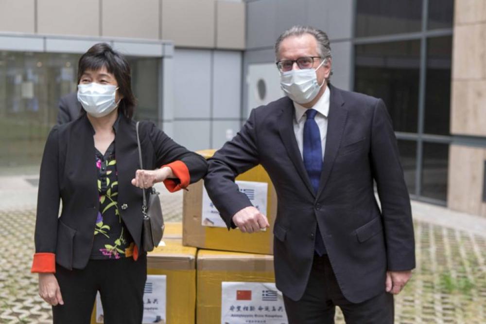 ATHENS, April 23 (Xinhua) -- Chinese Ambassador to Greece Zhang Qiyue (L) and Greek Alternate Migration and Asylum Minister Giorgos Koumoutsakos pose for a photo at the donation handover ceremony in Athens, Greece, on April 22, 2020. Greece welcomed on Wednesday the donation by China to help curb the spread of the novel coronavirus at hosting facilities, where thousands of refugees and migrants are accommodated.