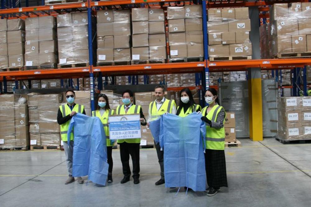 LONDON, April 23 (Xinhua) -- Delegates attend a ceremony as the Chinese community in Britain donates protective medical gowns in London, Britain, April 20, 2020. Amid growing concern over the personal protective equipment (PPE) shortage for the frontline medical staff, the Chinese community in Britain donated 30,000 protective medical gowns to the National Health Service (NHS) on Monday. The initiative We Care NHS, spearheaded by the London Chinatown Chinese Association (LCCA) and Zhejiang UK Association, gathers support and donations from more than a hundred Chinese community groups and individuals across the country since late March. The consignment of 30,000 medical gowns were handed over to Guys and St Thomas NHS Foundation Trust on Monday and about 70,000 surgical masks and other equipments are on their way, according to a press release of the British Chinese Community Group.