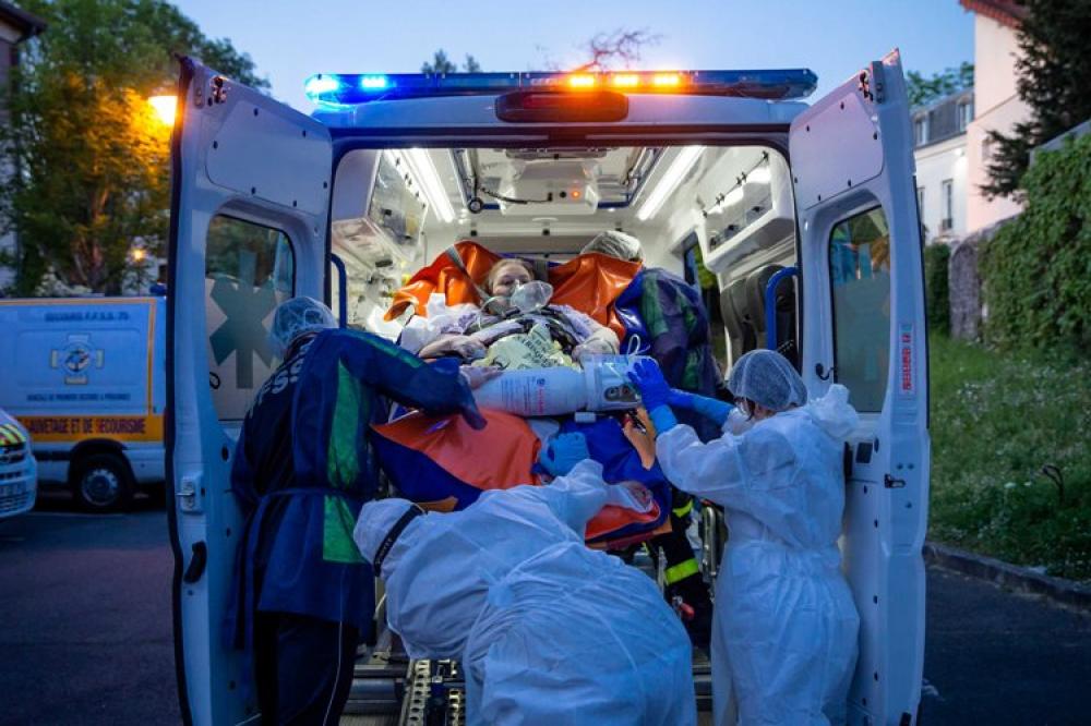 PARIS, April 23 (Xinhua) -- A COVID-19 patient is wheeled to an ambulance at an EHPAD (Housing Establishment for Dependant Elderly People) in Epinay sur Seine near Paris, France, on April 22, 2020. As of Wednesday, 29,741 people tested positive for the coronavirus were hospitalized, down by 365 in the last 24 hours, consolidating a one-week slowdown. The number of patients who need intensive care has fallen for the 14th consecutive day.
