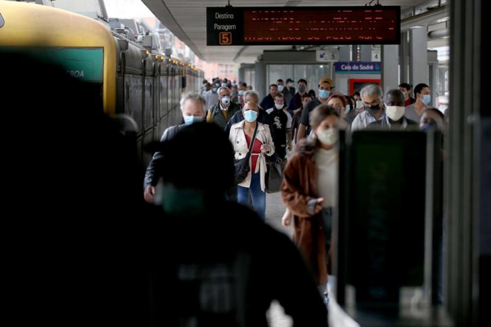 LISBON, May 5, 2020 (Xinhua) -- Passengers wearing face masks are seen at a train station in Lisbon, Portugal, May 4, 2020. Portugal started to revive its economy and society on Monday after nearly 50 days of lockdown under the state of emergency due to the COVID-19 pandemic. During the phase one of the three-step deconfinement from Monday to May 18, commercial centers up to 200 square meters and street stores are allowed to reopen with strict sanitary measures.