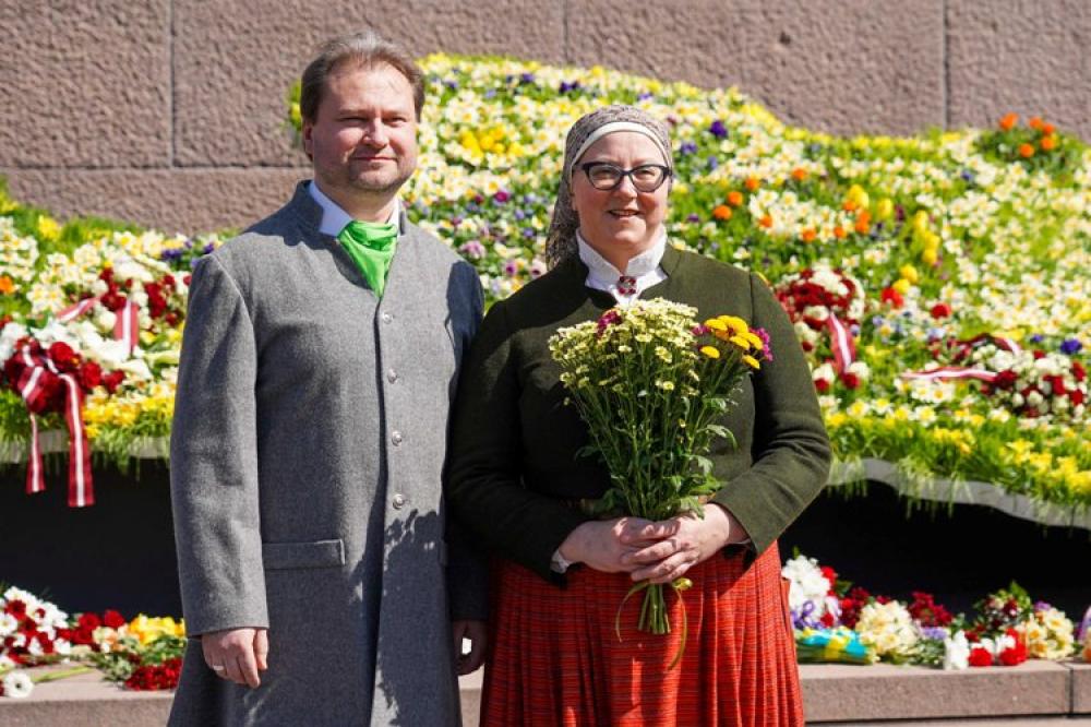 RIGA, May 5, 2020 (Xinhua) -- A couple dressed in Latvian national costumes pose for a photo while laying flowers to the Freedom Monument in Riga, Latvia, May 4, 2020, as the country marks the 30th anniversary of its declaration of independence. May 4 is celebrated by Latvians to mark the day the country declared independence from the former Soviet Union in 1990. Due to the COVID-19 pandemic, national-wide celebrations this year mostly took place at home as all annual events were cancelled.