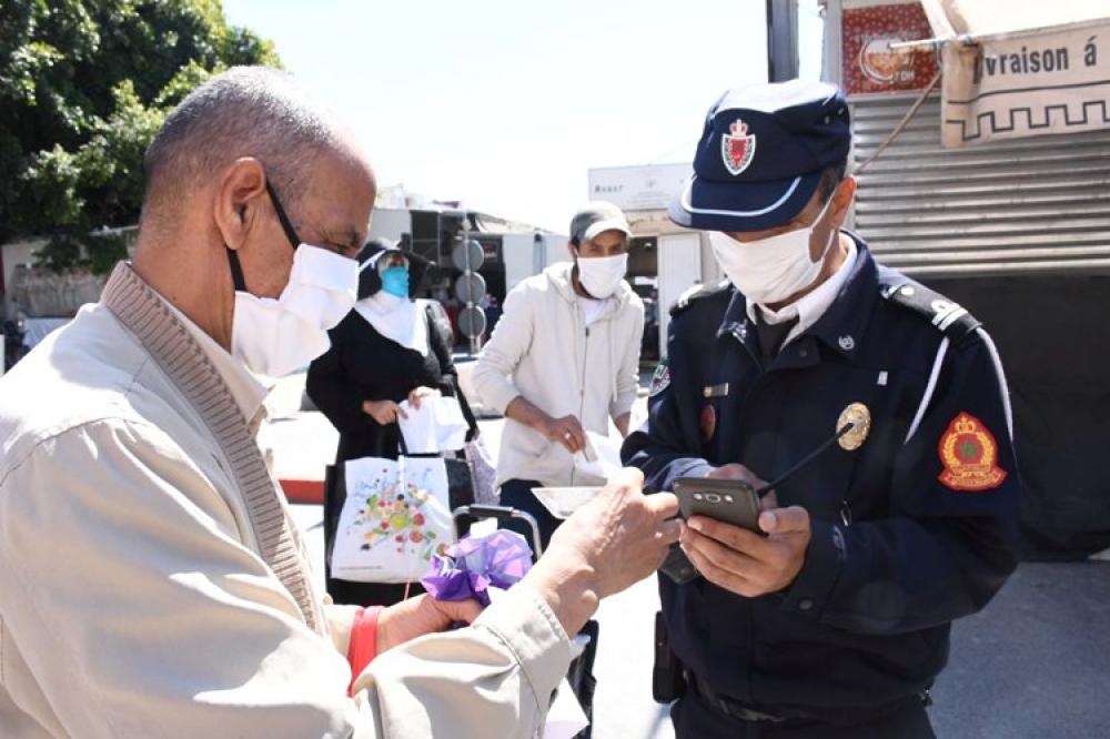 RABAT, May 10 (Xinhua) -- A police officer in protective face mask checks a pedestrian in Rabat, Morocco, May 9, 2020. In Morocco, the tally of COVID-19 cases rose to 5,910 after 199 new cases were added
