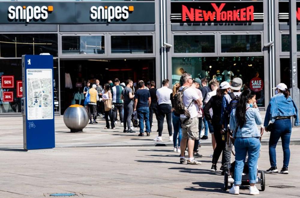 BERLIN, May 10 (Xinhua) -- Customers wait to enter a shop in Berlin, Germany, May 9, 2020. On Wednesday, German Chancellor Angela Merkel said COVID-19 restrictions in Germany would be eased while minimum social distance and hygiene rules would continue to apply.