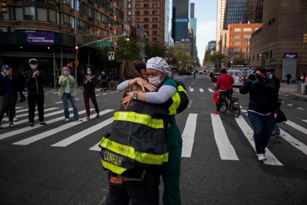 NEW YORK, May 10, 2020 (Xinhua) -- A firefighter hugs Samantha Giambalvo (R), a traveling nurse from Alabama who has been working in New York since April 6, as firefighters and residents show appreciation for healthcare workers at NYU Langone Medical Center amid the COVID-19 outbreak in New York, the United States, May 9, 2020. The number of COVID-19 cases in the United States reached 1,300,079 as of 3:32 p.m. (1932 GMT) Saturday, according to the Center for Systems Science and Engineering (CSSE) at Johns Hopkins University. Meanwhile, the death toll from the disease in the country hit 78,320.