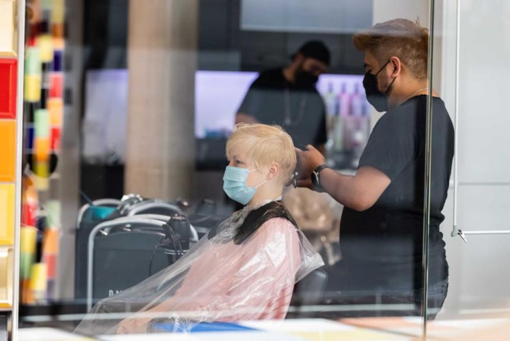 BERLIN, May 10 (Xinhua) -- A customer has a haircut in Berlin, Germany, May 9, 2020. On Wednesday, German Chancellor Angela Merkel said COVID-19 restrictions in Germany would be eased while minimum social distance and hygiene rules would continue to apply