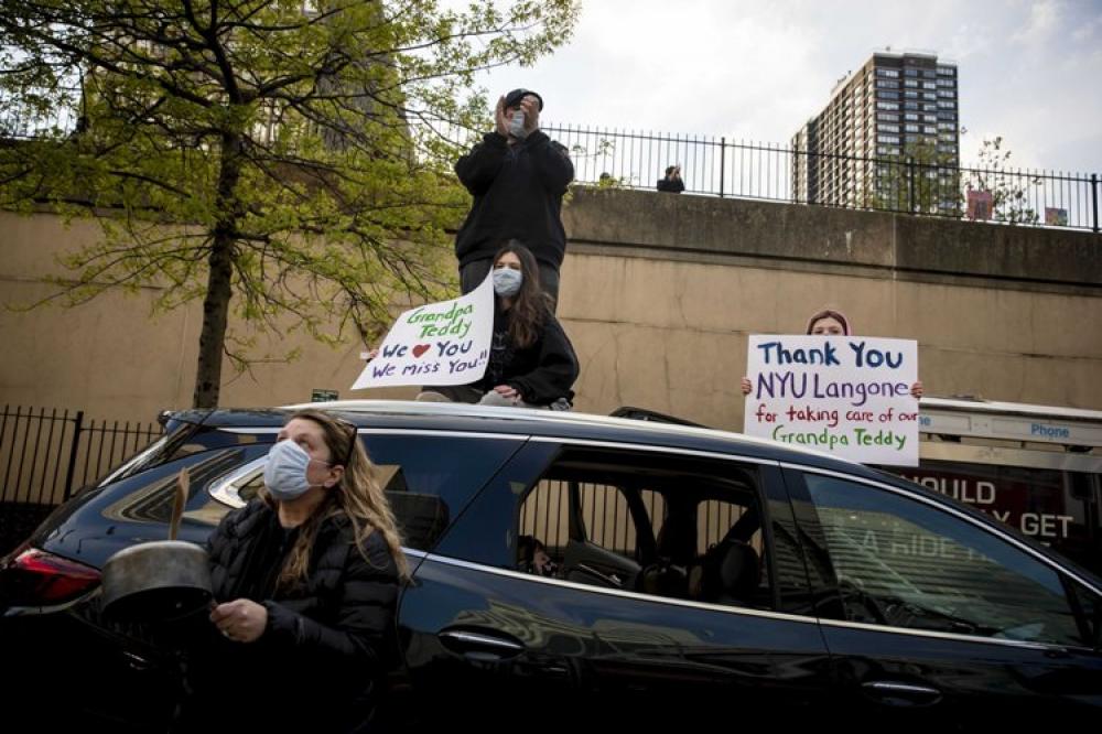 NEW YORK, May 10 (Xinhua) -- Family members of COVID-19 patient Teddy OConnor hold signs and show appreciation for healthcare workers at NYU Langone Medical Center amid the COVID-19 outbreak in New York, the United States, May 9, 2020. The number of COVID-19 cases in the United States reached 1,300,079 as of 3:32 p.m. (1932 GMT) Saturday, according to the Center for Systems Science and Engineering (CSSE) at Johns Hopkins University. Meanwhile, the death toll from the disease in the country hit 78,320.