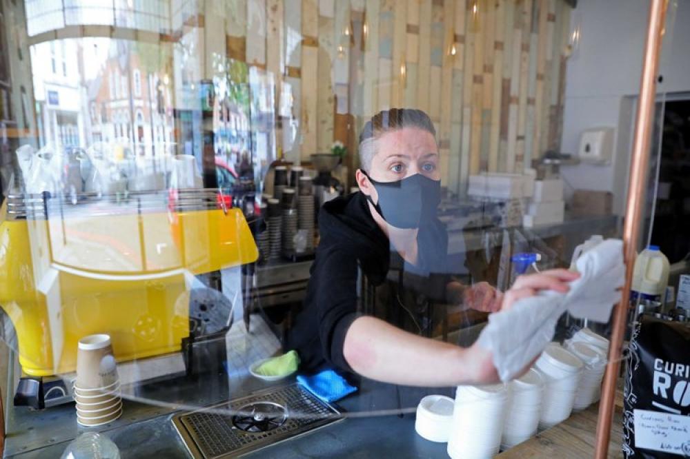 LONDON, May 18 (Xinhua) -- A clerk works in a coffee shop in London, Britain, May 17, 2020. Some restaurants, cafes and other catering shops in Britain have gradually resumed business with preventive measures like keeping social distancing after the British Government released a phased easing strategy from the novel coronavirus lockdown.