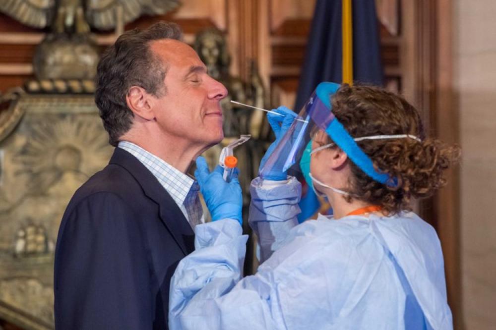 ALBANY (U.S.), May 18 (Xinhua) -- New York State Governor Andrew Cuomo (L) demonstrates how to get a COVID-19 test during a daily COVID-19 press briefing in Albany of New York State, the United States, on May 17, 2020. Cuomo announced on Sunday that New York State has doubled testing capacity to reach 40,000 tests per day, encouraging eligible New Yorkers to get tested for COVID-19.
