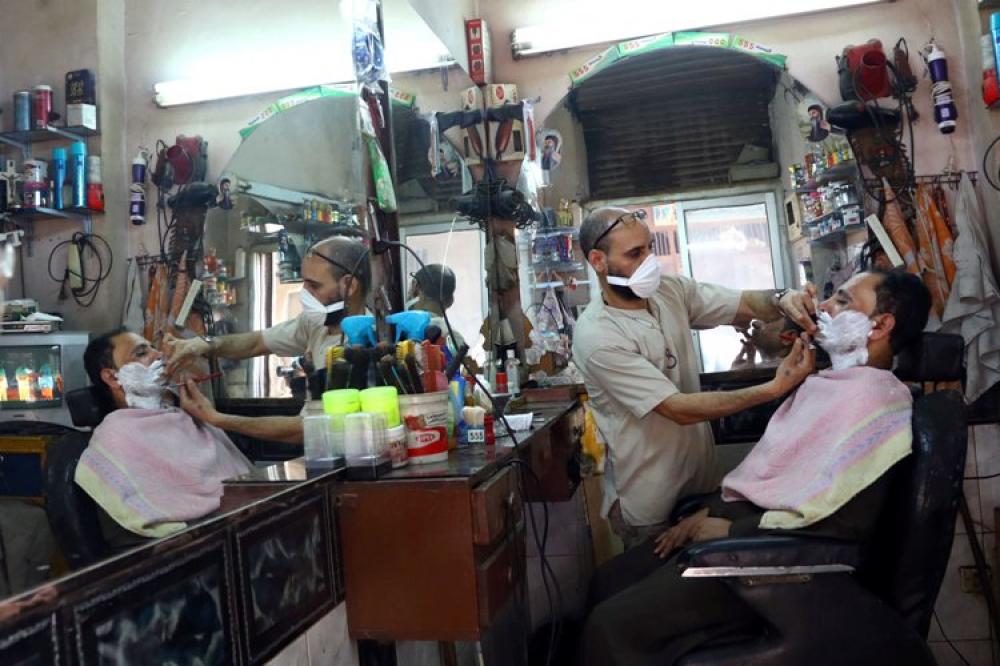 CAIRO, May 18 (Xinhua) -- A barber wearing a face mask shaves a mans beard at a barbershop in the Zabbaleen district, Cairo, Egypt, on May 17, 2020. Egypt witnessed on Sunday a daily record of 510 new COVID-19 infections, bringing the total cases registered in the country to 12,229.