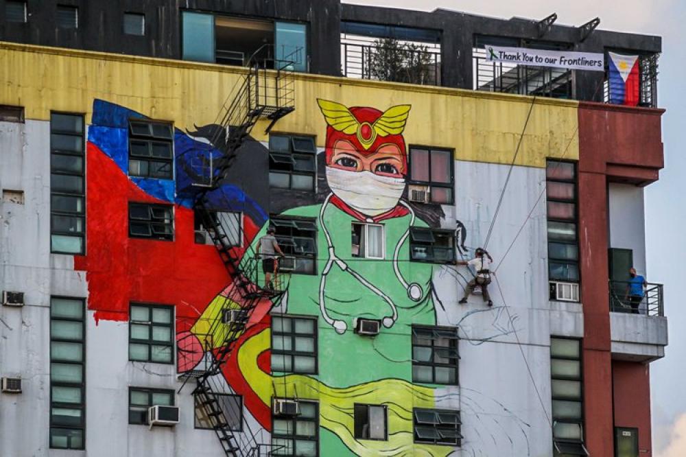MANILA, May 18 (Xinhua) -- Artists paint a mural of Darna, a Filipino fictional superhero, dressed as a doctor on a building to express their gratitude to all COVID-19 frontliners in Manila, the Philippines on May 17, 2020.