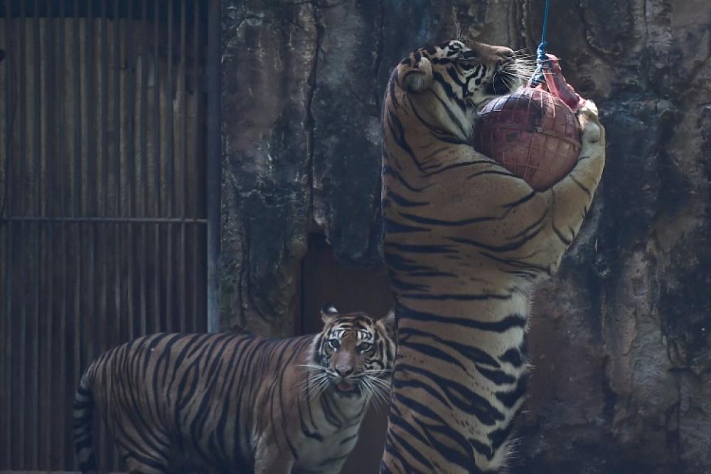 JAKARTA, May 18, 2020 (Xinhua) -- A Sumatran tiger tries to reach a piece of meat during an Instagram Live program in Ragunan Zoo amid the COVID-19 outbreak in Jakarta, Indonesia, May 18, 2020. Ragunan Zoo management has prepared the Instagram Live program since the zoo is closed to the public amid the COVID-19 outbreak.
