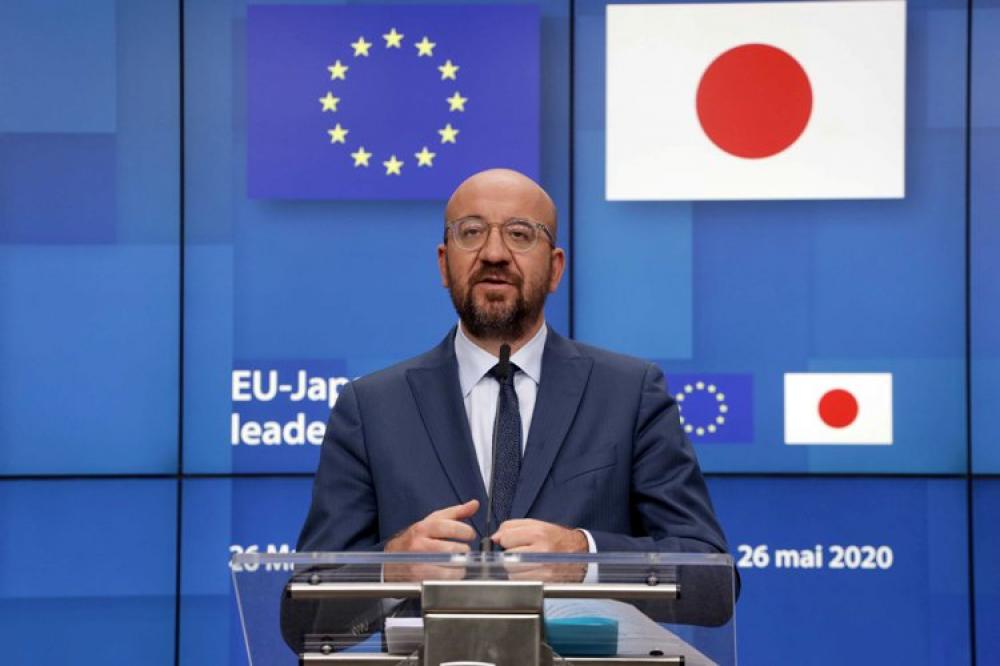 BRUSSELS, May 27, 2020 (Xinhua) -- Charles Michel, president of the European Council, attends a press conference following an EU-Japan videoconference summit at the EU headquarters in Brussels, Belgium, May 26, 2020. The leaders of the European Union and Japan said on Tuesday that global solidarity, cooperation, and effective multilateralism are required to defeat the coronavirus.