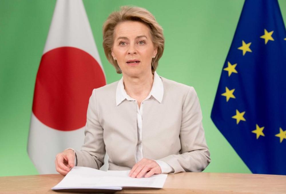 BRUSSELS, May 27, 2020 (Xinhua) -- Ursula von der Leyen, president of the European Commission, attends an EU-Japan videoconference summit at the EU headquarters in Brussels, Belgium, May 26, 2020. The leaders of the European Union and Japan said on Tuesday that global solidarity, cooperation, and effective multilateralism are required to defeat the coronavirus.